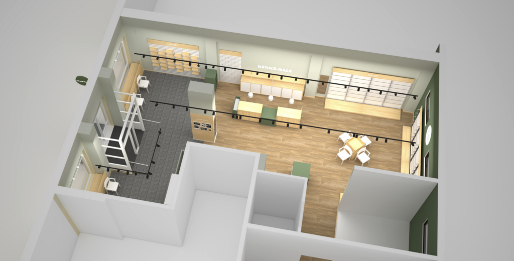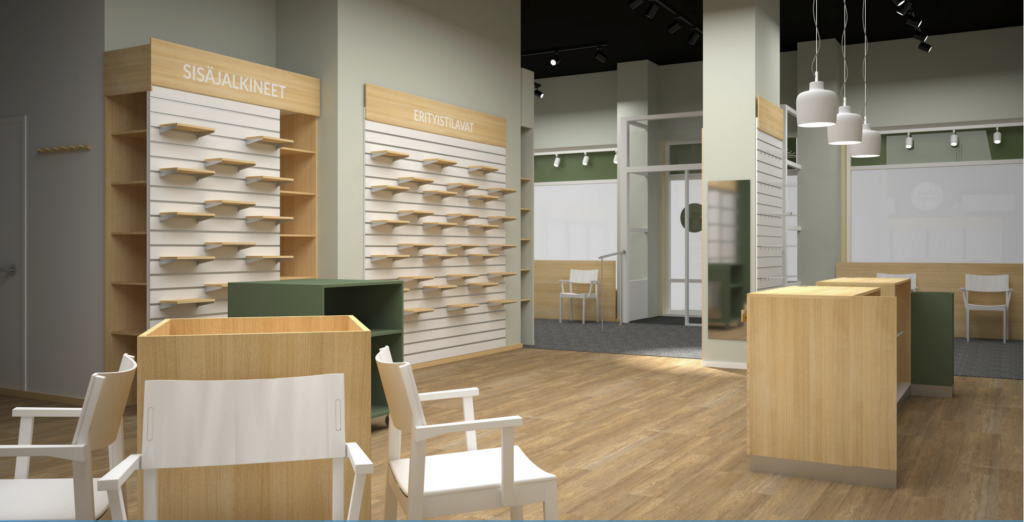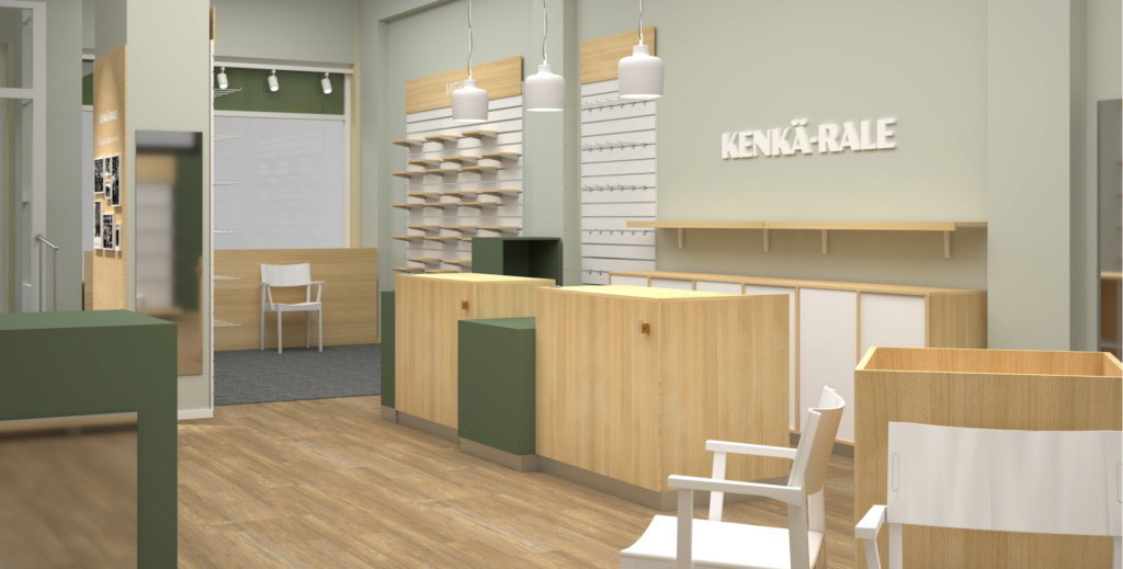 Uuden myymälän designin haluttiin kunnioittavan liikkeen historiaa – värimaailmaa haettiin luontevasti menneiltä vuosikymmeniltä. Liiketilan suunnittelussa esteettömyys ja kulkuväylien merkitys oli myös isossa roolissa, sillä osa Kenkä-Ralen asiakkaista on iäkkäämpiä. Ydinajatuksena oli myös kierrätys – osa vanhan myymälän kenkähyllyistä kunnostettiin ja modernisoitiin uuteen tilaan. Kokonaisuudesta tuli upea kokonaisuus, jossa trendikkäästi yhdistetään vanhaa ja uutta.