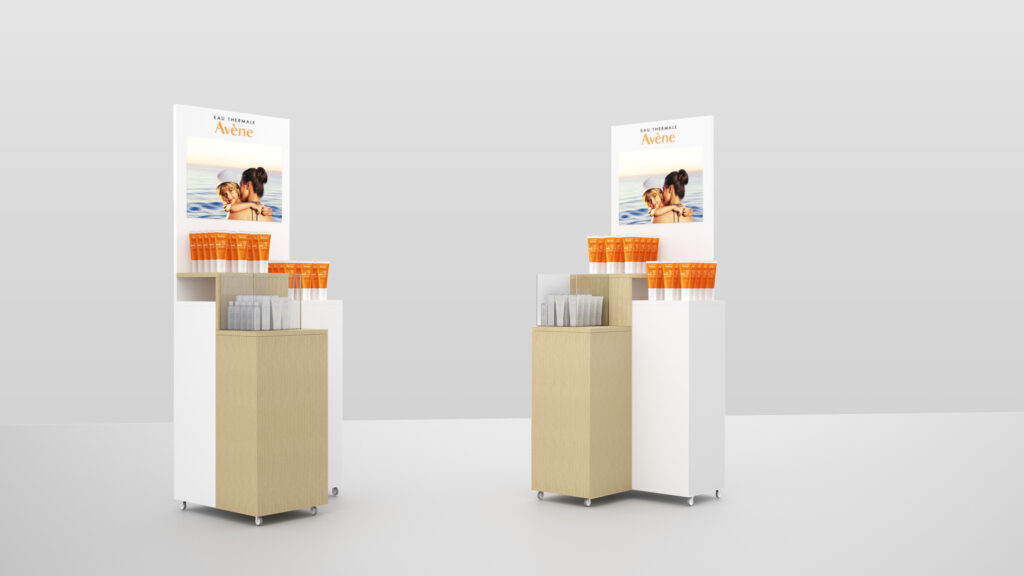Toteutimme lääke- ja kosmetiikkayritys Pierre Fabren Avène ihonhoitosarjan tuotteille Suomen apteekkeihin näyttävän tuote-displayn. Lähtökohtana oli tehdä puurakenteinen kestävä display, johon brändi -ilmeen vaihtaminen olisi mutkatonta apteekeissa. Asiakkaalla ja Fair Factorylla oli vahva tahto lähteä kehittämään kestävän kehityksen apteekkituotetta, joka ei muutaman kuukauden käytön jälkeen päädy roskikseen, vaan palvelee asiakkaan tarpeita useita vuosia!