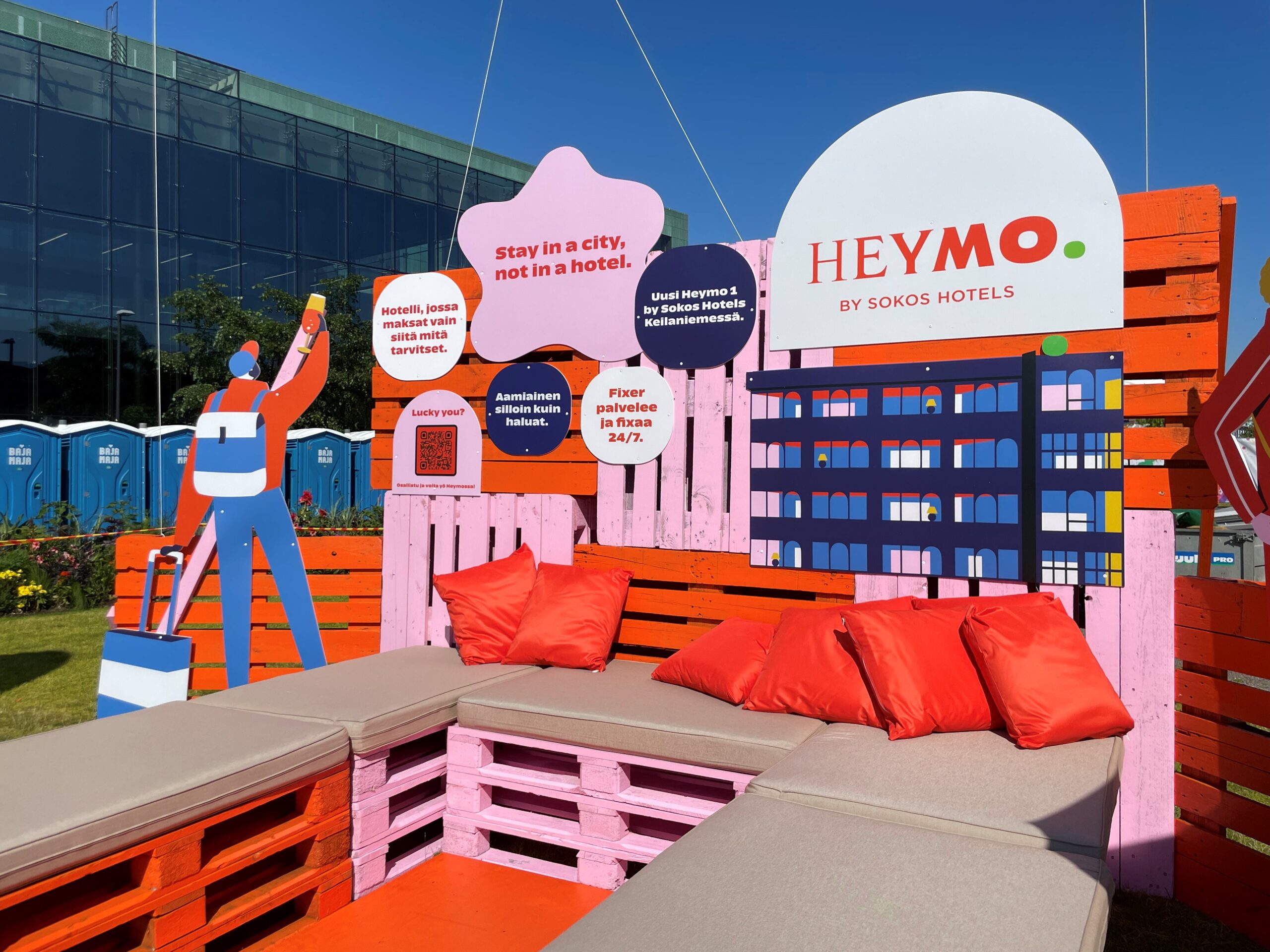 Sokos Hotelsin uusi hotellityyppi Heymo toimi UNation 23 – festivaalin yhteistyökumppanina kesäkuussa 23. Fair Factoryä pyydettiin suunnittelemaan ja toteuttamaan tapahtumaan ”Heymo festarilounge”, joka toimisi festarivieraiden ”levähdyspaikkana” eli siinä voisi istahtaa. Lisäksi toivottiin, että piste olisi kuvauksellinen ja someystävällinen.