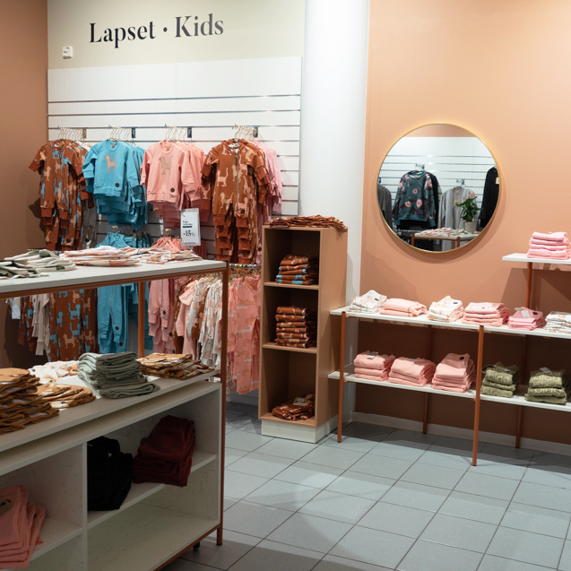 Kun brändin arvoja ovat vastuullisuus, eettisyys, hauskuus ja kestävyys myös myymälän haluttiin ilmentävän näitä arvoja. Ilmeessä yhdisteltiin industrial -henkistä rouheutta (aaltopeltiä, osb-levyä) ja ihanaa arjen luksusta tuomalla mukaan ripaus kultaa. Pehmeää tunnelmaa, josta raikkaat designit nousevat esiin, luotiin pehmeillä Tikkurilan sävyillä K479 ja X460.